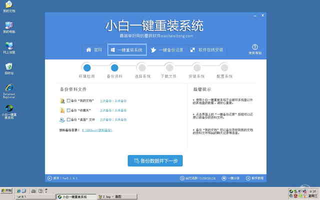 点击立刻重装系统,,小白将检测当前的系统环境,并且帮助用户备份旧系统里的关键目录下的资料,这一点做得比较的贴心。但是如果用户在系统分区其它目录下还保存有文件的话,记得手动备份。
