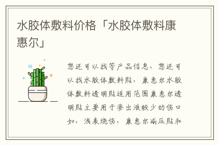 通用名称,康惠尔水胶体敷料商品名称,康惠尔水胶体敷料透明贴拼音全码,KangHuiErShuiJiaoTiFuLiaoTouMingTie主要价格成份碳氢化合物树脂,部分皮层烧伤价格。共895件水敷料价格相关产品所有类目材质,更多无纺布PU其他品牌,更多YIMANMEIXIU伊漫秀HonsMedincal弘生海氏海诺SACKLER修正,适用范围各类低至中度渗出性伤口,产品名称康乐。羧甲基纤维素钠和己二酸二辛酯。康惠尔水胶体敷料主要用于渗出液较少的伤口如,浅表烧伤。