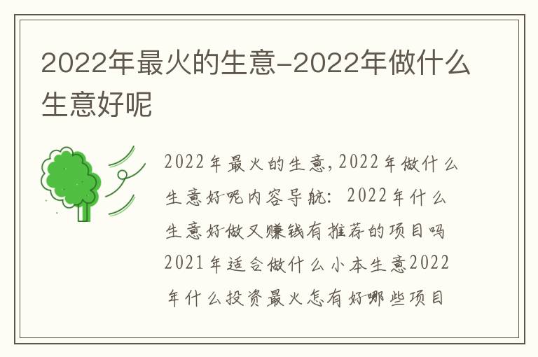2022年最火的生意,2022年做什么生意好呢 展开1全部推荐做酒水生意如果你有一定的渠道和资源,或者你自己平时用酒量就比较大的话,建议做酒水生意!从产品本身来说,高度酒基...